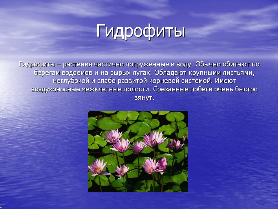 Высшие водные растения является неотъемлемым средообразующую компонентом водных экосистем, поскольку относятся к автотрофных организмов, образующих первичную пищевой продукции в результате своей фотосинтетической деятельности. Именно поэтому водные растения играют ведущую роль в функционировании гидроэкосистем и во многом обусловливают структуру биотического группировки водоемов. Видовой состав и распределение гидрофитов в водоеме зависит от его генезиса и ряда экологических условий, среди которых наиболее важными являются такие, как прозрачность воды, морфология котловины, характер донных отложений, химический состав водной массы, ее кислотность, трофнисть и минерализация. Причем количество основных питательных веществ (азота и фосфора) может выступать одновременно и как лимитирующий, и в качестве стимулирующего фактора развития тех или иных растительных сообществ в водоеме. Чувствительность к уровням обеспеченности питательными веществами дает возможность рассматривать многие гидрофитов в качестве показателя естественного и антропогенного эвтрофирования водоемов, в которых они выполняют роль продуцентов органического вещества и биофильтров. Относительная однородность водной среды привела к ряду приспособлений разной степени. Многие виды водных растений обладают способностью развиваться на суше, выражающееся в явлении диморфизма. Попав в водную среду, эти виды способны развиваться в воде. Наличие устойчивого механизма гомеостаза позволяет высшим водным растениям захватывать значительные территории и иметь широкое географическое распространение. Такие виды создают популяции, приспособленные к крайним условиям ареала, значительным колебаниям света, температуры и т.д.. Видовой состав водных растительных сообществ позволяет достаточно точно охарактеризовать экологическое состояние экосистемы. Среди морфоанатомичних особенностей водных растений, которые можно учитывать при определении состояния биоценоза, являются: ? Погруженные в воду гидатофиты получают не все количество солнечных лучей, они теневыносливыми. Это приводит к увеличению поверхности органов сравнению с общей массой. В связи с тем, что в воде мало растворенного кислорода, в гидатофитив затруднен газообмен. Однако у них хорошо развиты межклетниках, которые способствуют регулированию газообмена. Гидатофиты имеют очень упрощенную анатомическое строение, сосуды слабо развиты или вовсе нет, воду воспринимают всей поверхностью тела. На поверхности эпидермиса кутикулы нет или она тонкая, чтобы не создавать препятствие в поступлении воды в клетки. ? Гидрофиты обычно растут по берегам водоемов, их подземная часть и большая часть стебля погружены в воду. Гидрофиты имеют систему хорошо развитых межклеточных промежутков, через которые осуществляется поставка кислорода к органам. ? Гигрофиты — это растения, приспособленные к росту в условиях избыточного увлажнения, преимущественно атмосферного. Листья их покрыты тонким слоем кутикулы, устьица расположены на уровне основных клеток эпидермиса, наличие тонкостенных живых рассеянных волосков, а также широких межклетников — обеспечивает достаточно активную поверхность испарения. Все эти анатомо-морфологические характеристики позволяют выделять водные и прибрежно-водные раст
