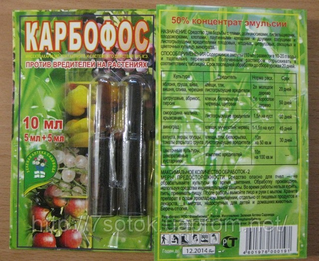 Карбофос (малатион, малатон, фосфатион) выпускается в виде 30 — и 50%-ного концентрата эмульсии. Светло-коричневая жидкость с неприятным запахом. Ограничено устойчивый препарат средней токсичности. Действует на насекомых и клещей кратковременно, как контактный яд. Эффективен против тлей, цикадок, клопов, гусениц и личинок минируют листья, клещей, жуков и их личинок, а также молодых личинок (бродяжек) щитовок. Можно использовать в смеси с другими инсектицидами и фунгицидами, которые не имеют щелочной реакции. Применяется в концентрации 0,15-0,3%.
