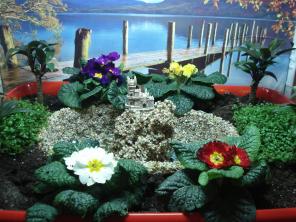 Для небольших емкостей достаточно 3-5 растений. Сначала выбирают самое высокое, оно служит зрительным фокусом композиции (размещать его в центре необязательно). С суккулентов подходят цереус, опунция, алоэ; из теплолюбивых декоративно-лиственных — сансевьера, родея, драцены, кордилины, мирт. Затем высаживают более компактные растения (различные шаровидные кактусы, цветущие сенполии, бромелиевые, хлорофитум), наконец, сбоку особенно эффектно выглядят виды со свисающими стеблями (очитки, сциндапсус, плющ). Следует учитывать, что при правильном уходе все они будут разрастаться. Хорошим дополнением к растениям может быть красивый камень с неровной поверхностью, коряги, согнутая ветка.