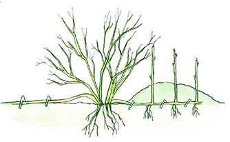 Когда новые побеги с отсадков достигают высоты 12 — 15 см, их обертывают влажной почвой. Через 15-20 дней почву нагребают вторично. Саженцы выкапывают механизированным способом. Для этого используют дугообразный чем, смонтированный на самоходном шасси Тг16М. Перед выкапыванием верхушки побегов скашивают косилкой. Отсадки от маточного куста отделяют дисковым ножом, который закреплен спереди левого стояка дугообразного ножа. Выкопанные однолетние саженцы высаживают в питомник на доращивание.