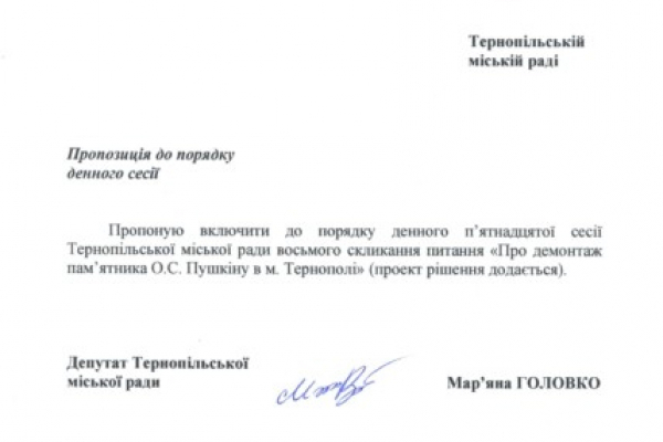 – Прошу включить в повестку дня пятнадцатой сессии Тернопольского городского совета восьмого созыва вопрос о демонтаже памятника А.С. Пушкину в Тернополе, – речь идет в предложении к повестке дня депутата», — говорится в проекте.