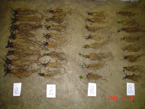 Засыпают корни рассады рыхлой землей вручную и хорошо поливают водой. С наступлением постоянных низких температур (ниже минус 10-12 ° С) при отсутствии снега растения укрывают легким материалом: камышом, листьями, соломенными матами и т.д.. Прикапывают на зиму только первосортную стандартную рассаду.