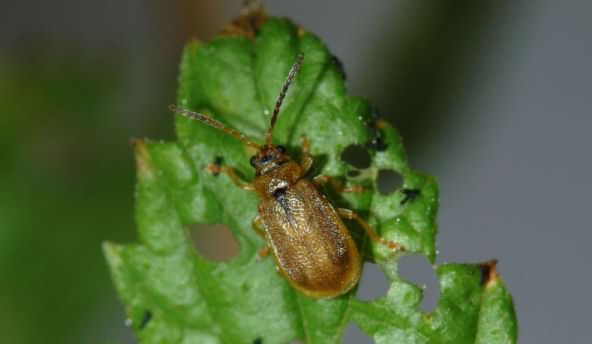 Жуки мелкие, длиной 3-4 мм, буровато-желтого цвета. Надкрылья равномерно выпуклые (не приплюснутые). Зимуют жуки под сухими листьями, комочками земли, растительными остатками и т.д.. В конце апреля — начале мая, когда среднесуточная температура составляет +13 ° С, жуки выходят и начинают питаться, скелетируют молодые листочки земляники, уже развернулись. Иногда выедают в листьях сплошные дыры, которые, сливаясь, образуют «окошки», или обгрызают кожицу на черешках листьев, или выгрызают ранки на чашелистики и лепестки цветков. С середины мая начинается яйцекладка, которая длится до начала июля. Каждая самка откладывает от 87 до 200 яиц, размещая их в основном с нижней стороны листьев по 1-2, иногда по 5-7 шт. Яйца мелкие, шаровидные, слегка овальные, сначала ярко-желтые, позже приобретают желтовато-розового цвета.